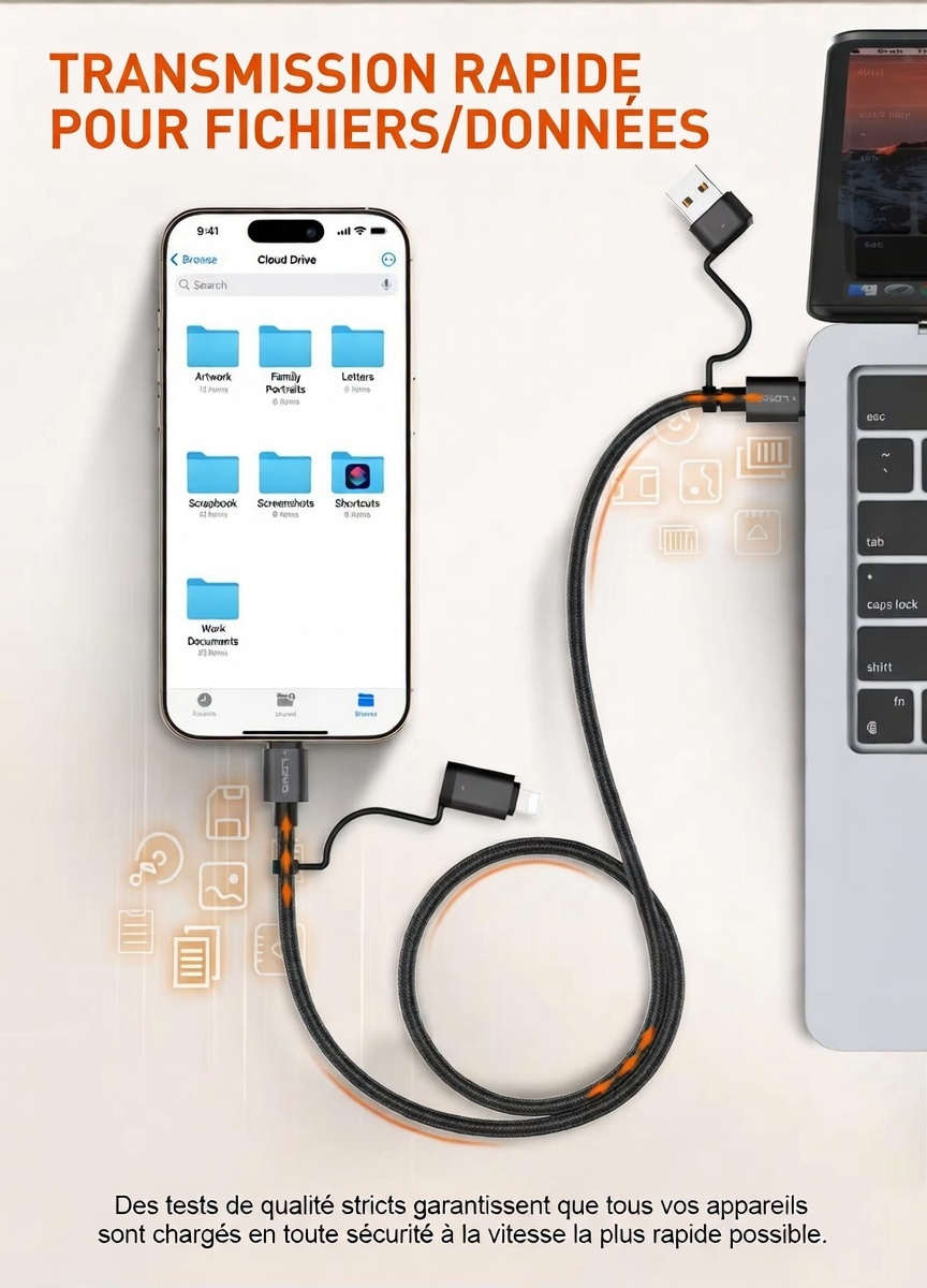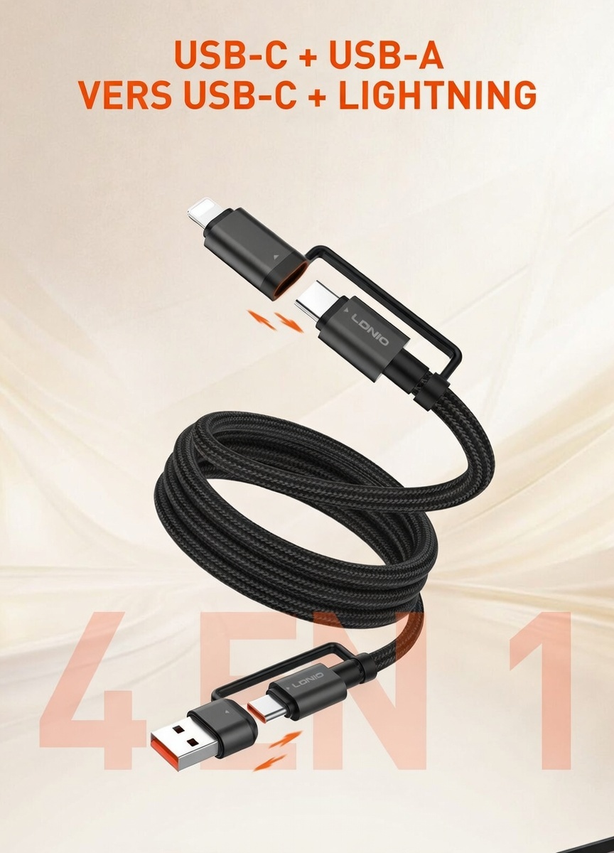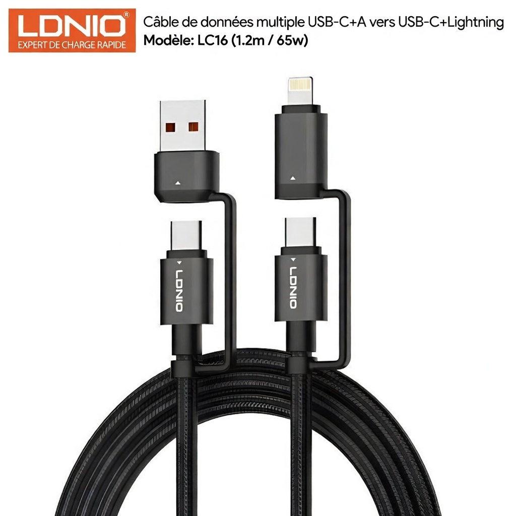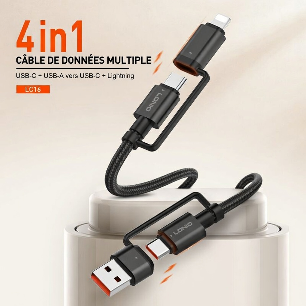 Câble de charge rapide LC16, Adaptateur USB-C + USB-A vers USB-C + Lightning