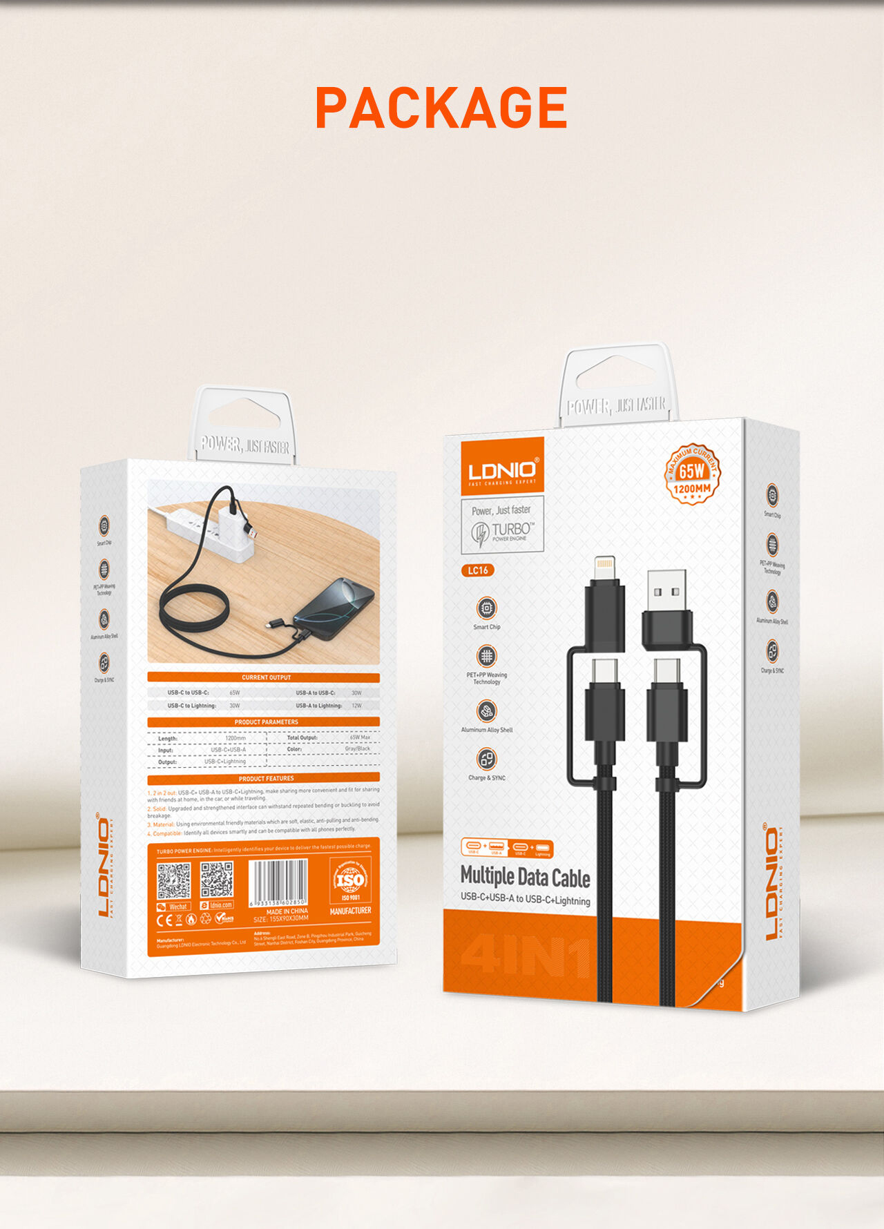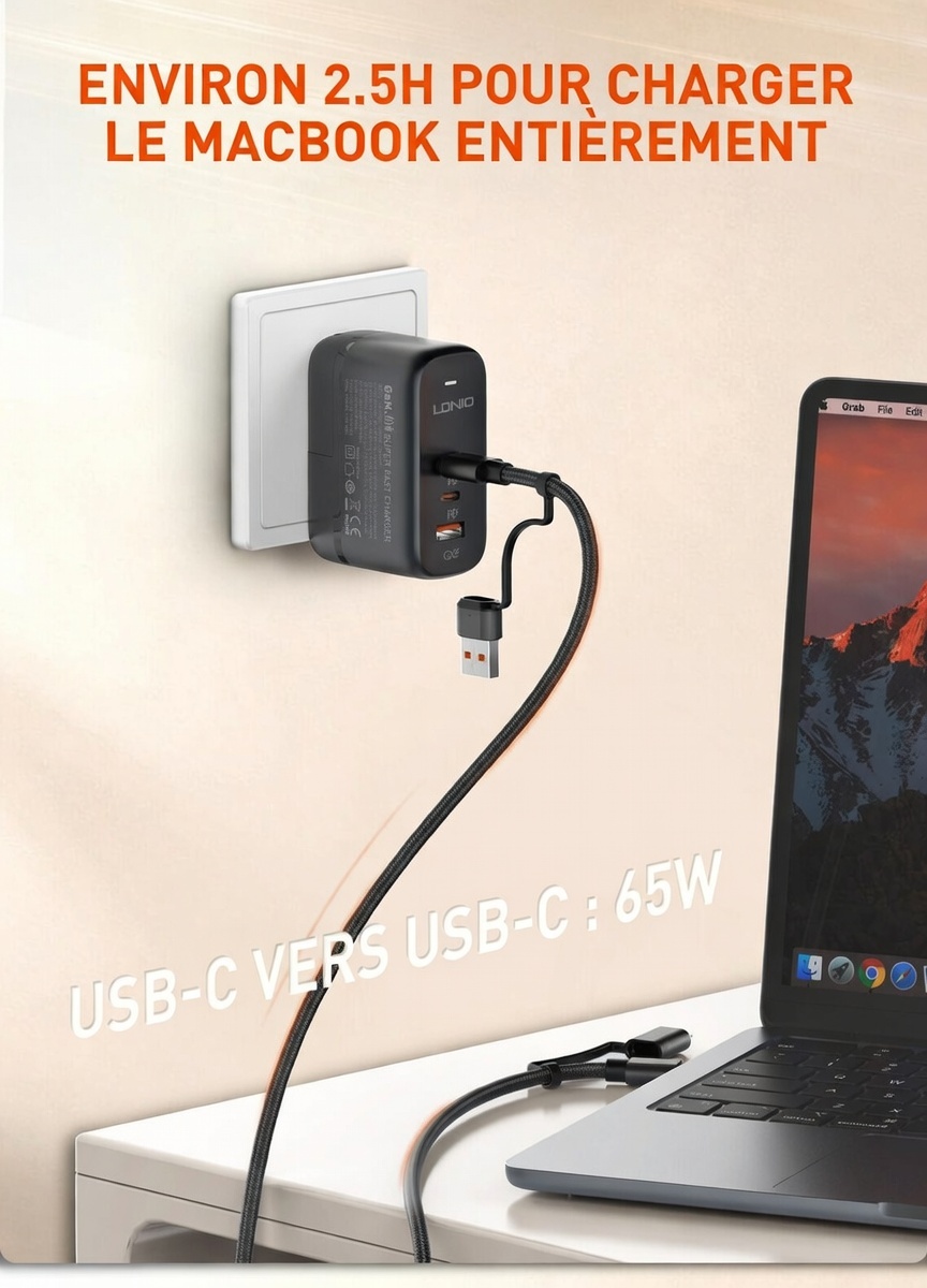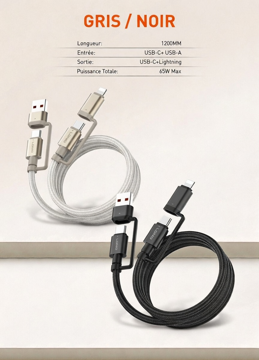 2. Configurations : USB A-C 50 W / USB A-Lightning : 12 W / Type C-Type C : 65 W / Type C-Lightning : 30 W