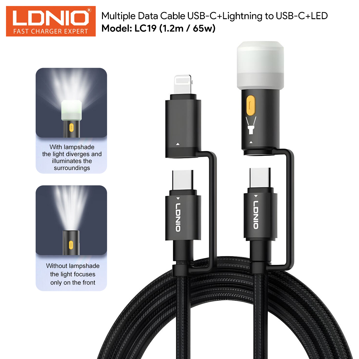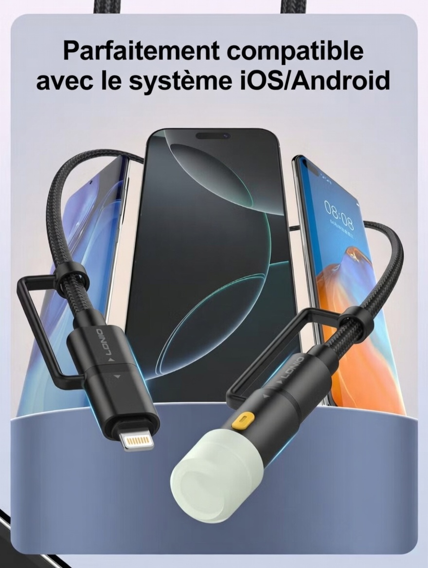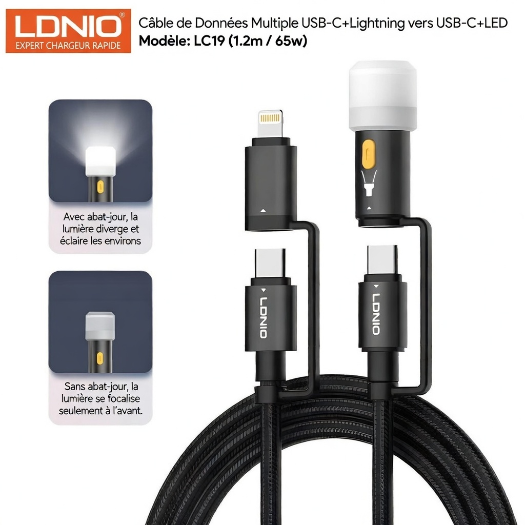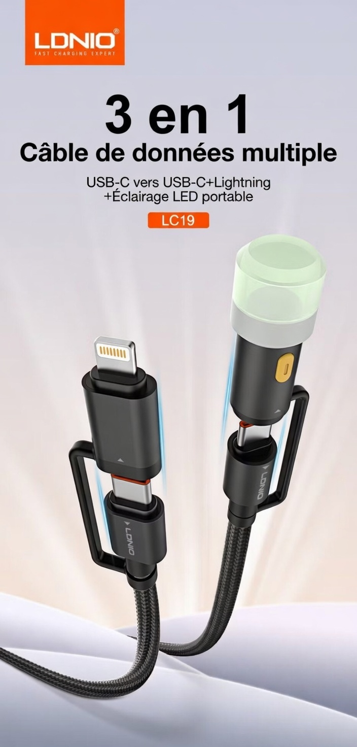 Câble de charge rapide LC19, Câble de données multiple 4 en 1 USB-C vers USB-C + Lightning + éclairage LED