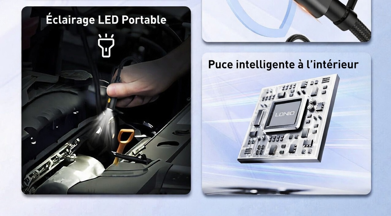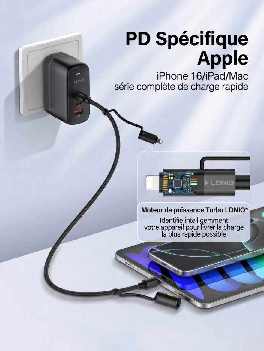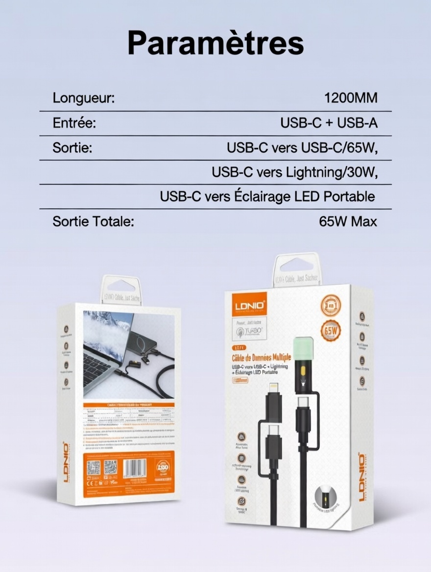 2. Configurations disponibles : USB A-C 50 W / USB A-Lightning : 12 W / USB C-USB C : 65 W / USB C-éclairage LED