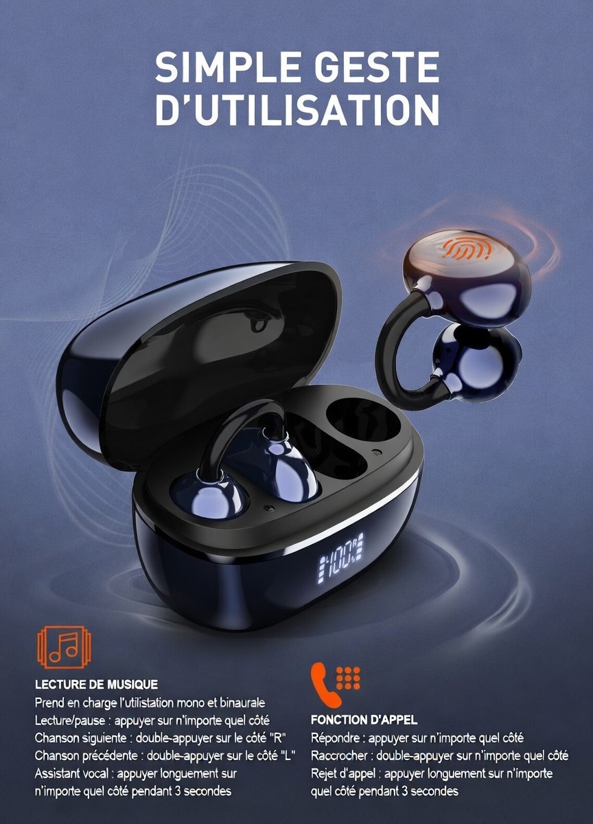 Écouteurs intra-auriculaires stéréo sans fil Bluetooth ouverts T09 NOIR