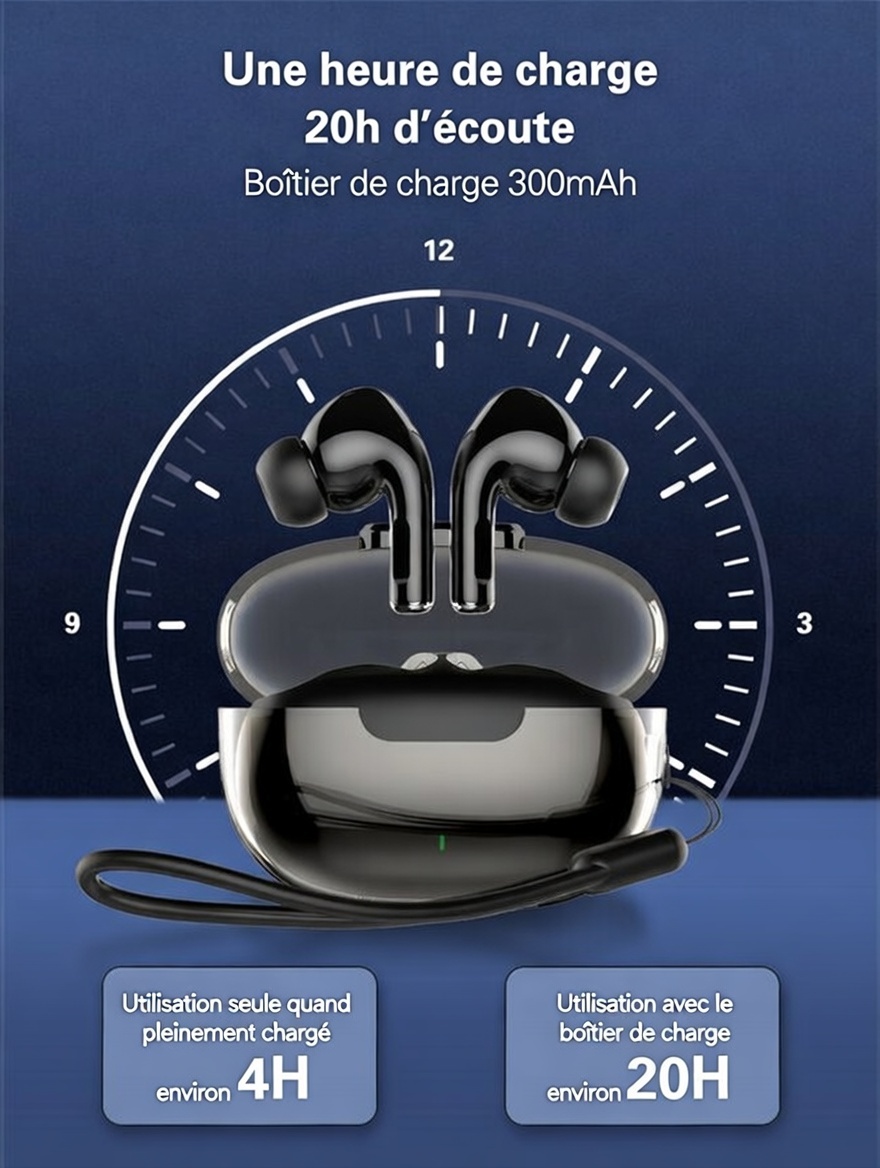 Capacité de la batterie du boîtier de charge : 300 mAh