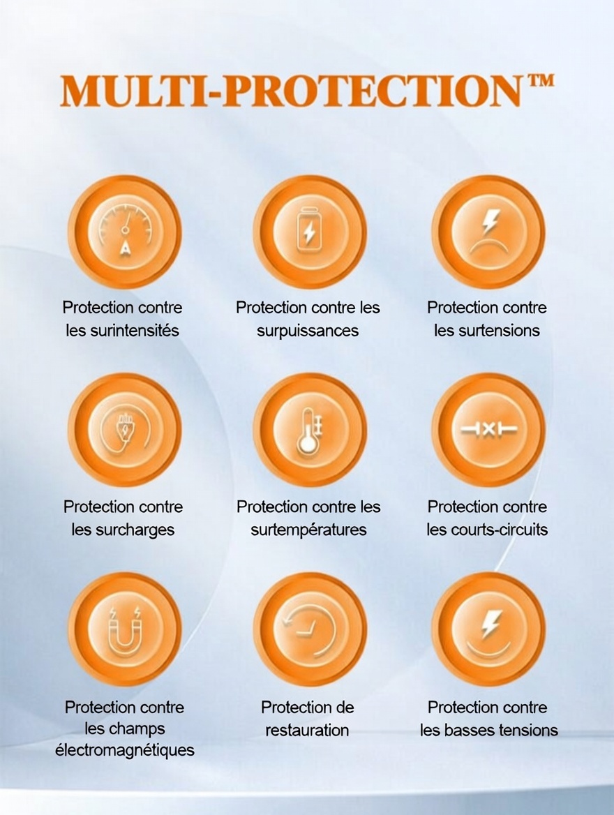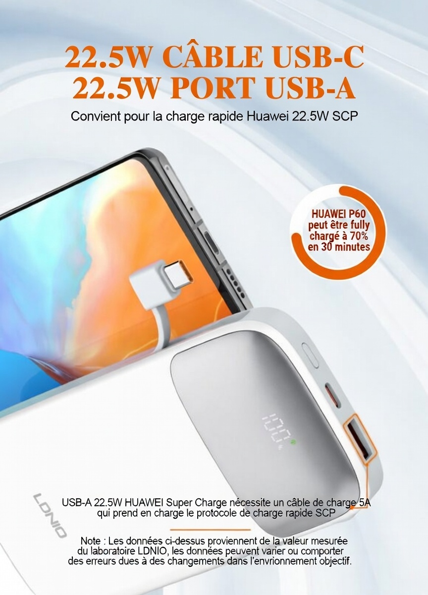 Sortie USB-A (QC) : 4,5 V/5 A (SCP), 5 V/4,5 A (SCP), 9 V/2 A, 12 V/1,5 A (22,5 W)