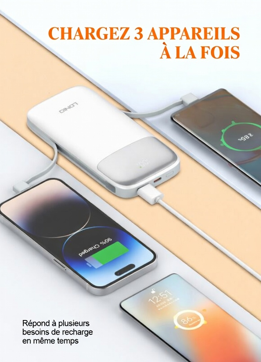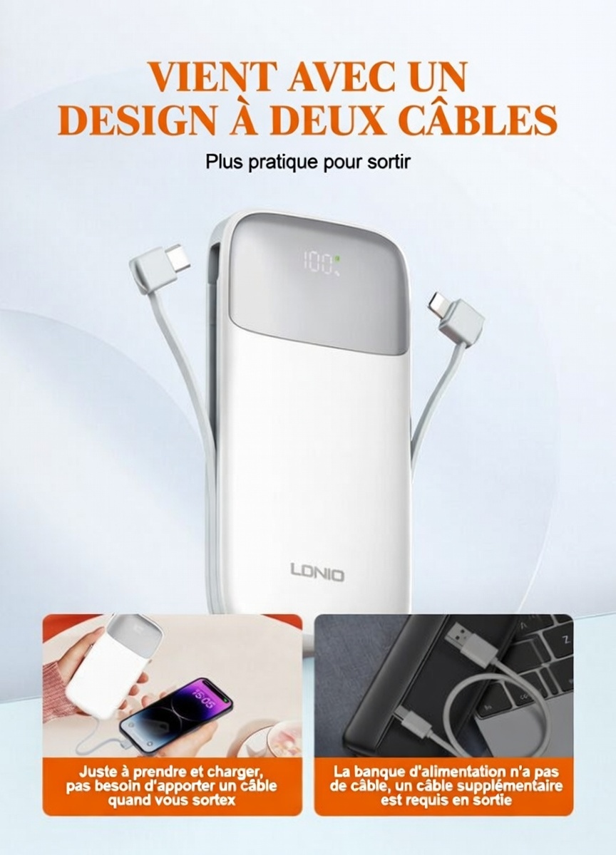 Power Bank LDNIO PQ20 pour smartphones universels, avec câble intégré et charge rapide, 20 000 mAh/37 Wh, TC : 22,5 W/SCP + Lightning : PD 20 W