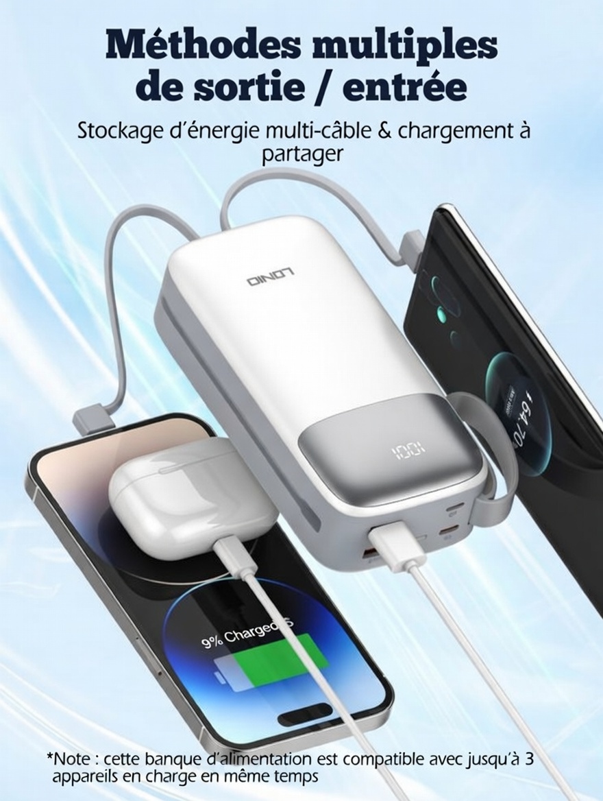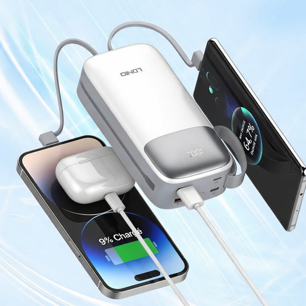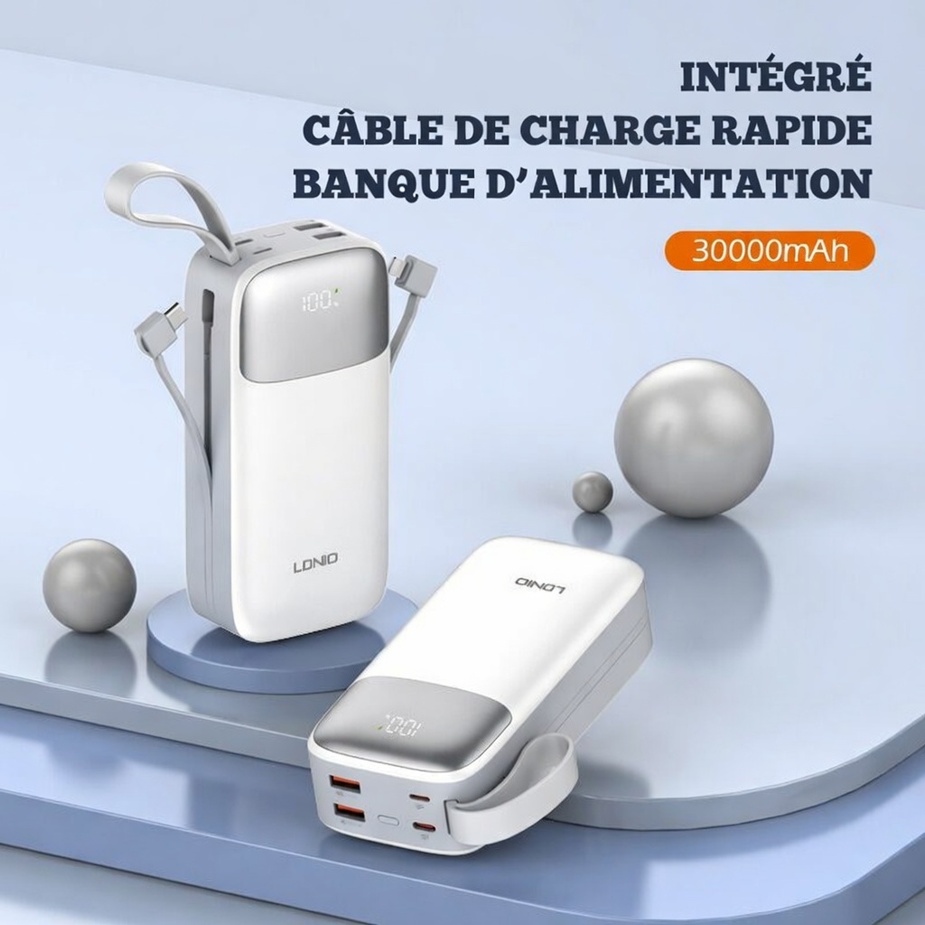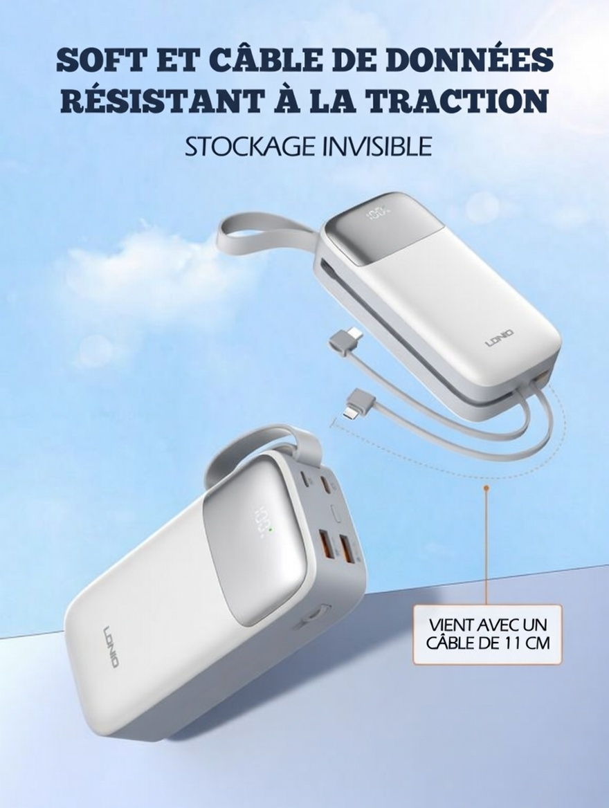 Power Bank LDNIO PQ30 pour smartphones universels, avec câble intégré et charge rapide, 30 000 mAh/37 Wh, TC : 22,5 W/SCP + Lightning : PD 20 W