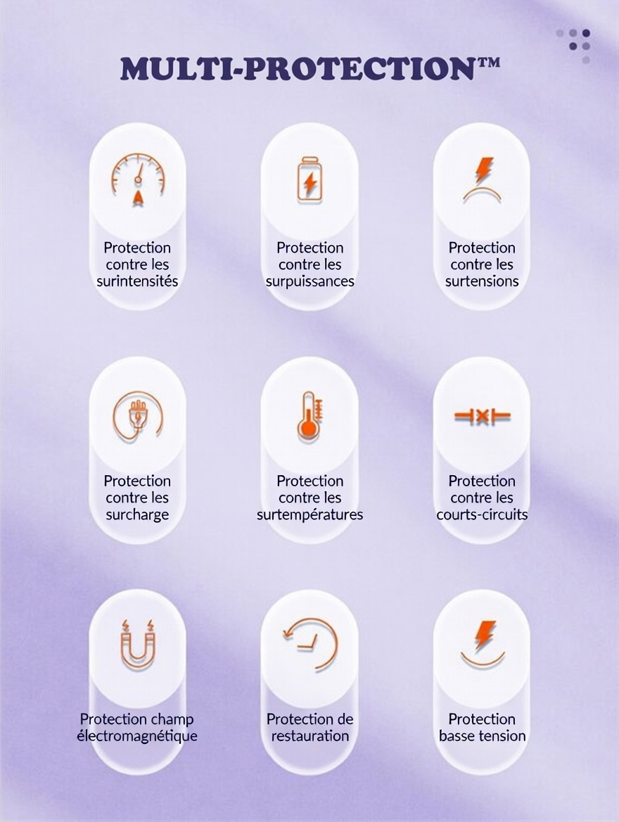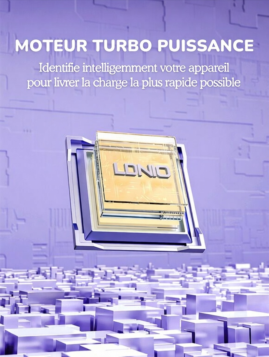 Sortie USB-A1 : 4,5 V/5 A (SCP), 5 V/4,5 A (SCP), 9 V/2 A, 12 V/1,5 A (22,5 W)