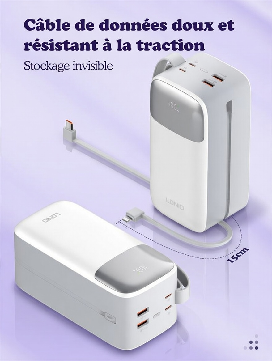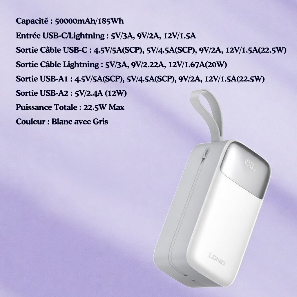 Power Bank LDNIO PQ50 pour smartphones universels, avec câble intégré et charge rapide, 50 000 mAh/37 Wh, TC : 22,5 W/SCP + Lightning : PD 20 W